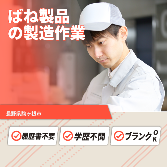 給与詳細 月収例 200,000円 日給例 10,000円 勤務地 長野県駒ヶ根市 仕事内容 自動車部品や精密機器に使用されるばねの製造