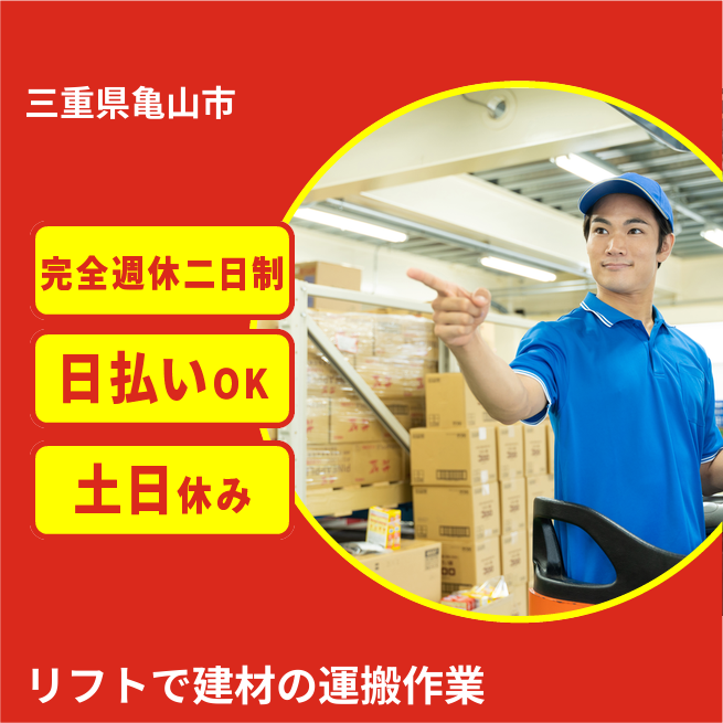 給与詳細 月収例 224,000円 日給例 11,200円 勤務地 三重県亀山市 仕事内容 カウンターリフトで製品の運搬作業|リフト免許必須(寮費無料)