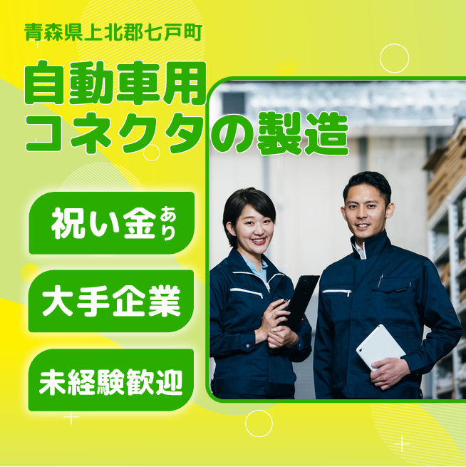 給与詳細 月収例 209,550円 時給例 1,100円 勤務地 青森県上北郡七戸町 仕事内容 【自動車用コネクタ製造】