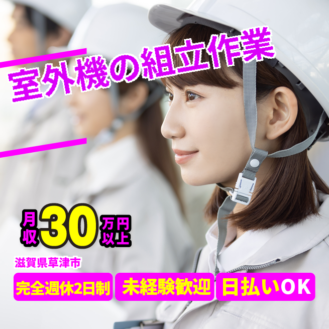給与詳細 月収例 300,000円 日給例 12,000円 勤務地 滋賀県草津市 仕事内容 電動ドライバ、エアドライバを使用し、ルームエアコンの室外機の組立、などの業務をライン作業で行う。