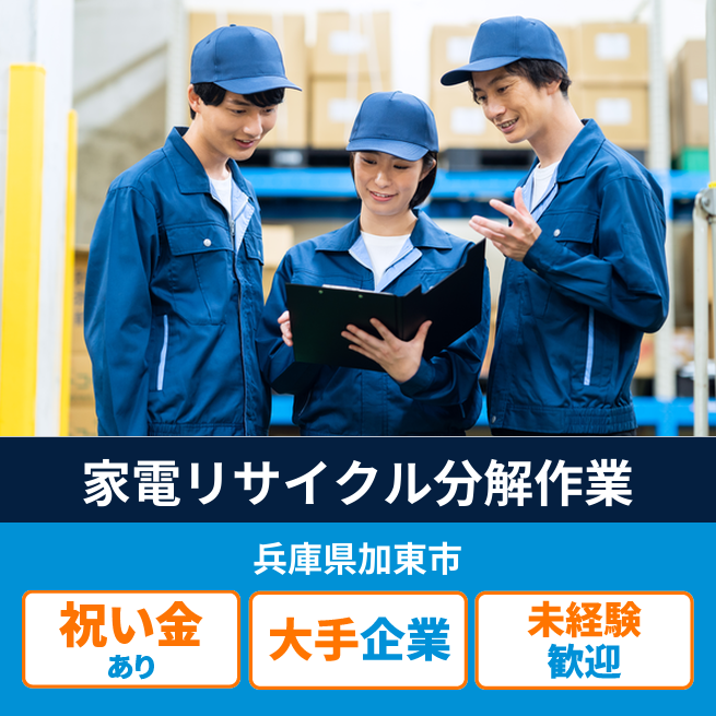 給与詳細 月収例 180,000円 時給例 1,125円 勤務地 兵庫県加東市 仕事内容 【家電のリサイクル(コツコツ分解、機械の操作など】