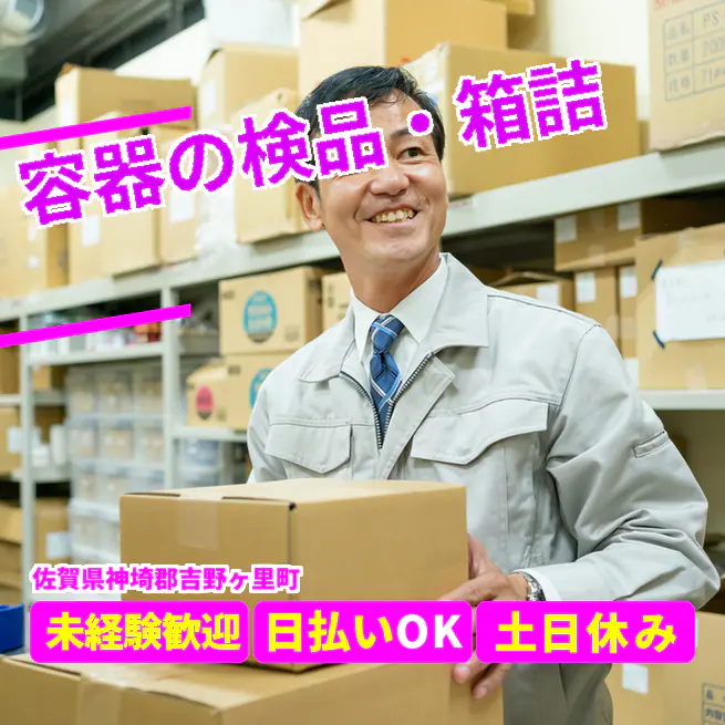 給与詳細 月収例 200,000円 時給例 1,200円 勤務地 佐賀県神埼郡吉野ヶ里町 仕事内容 【業務内容】プラスチック容器の品質管理と梱包作業