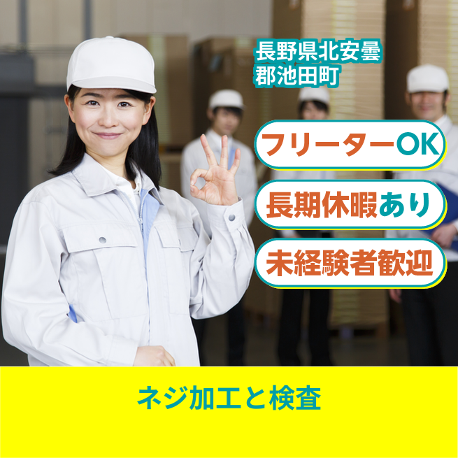 ◆日払い・仮払いOK(アプリでカンタン申請!) 交通費 支給あり 応募の流れ 本ページ内<応募する>ボタンより、必要項目をご入力の上、ご応募ください。 勤務地 【勤務地】長野県北安曇郡池田町- 勤務時間 【勤務地】8:30~17:05(休憩45分)