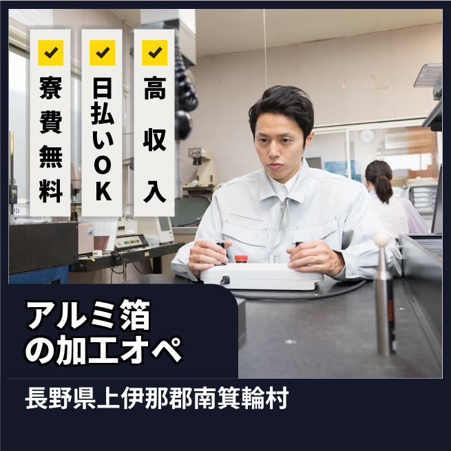 給与詳細 月収例 290,000円 日給例 12,400円 勤務地 長野県上伊那郡南箕輪村 仕事内容 【アルミシート加工】