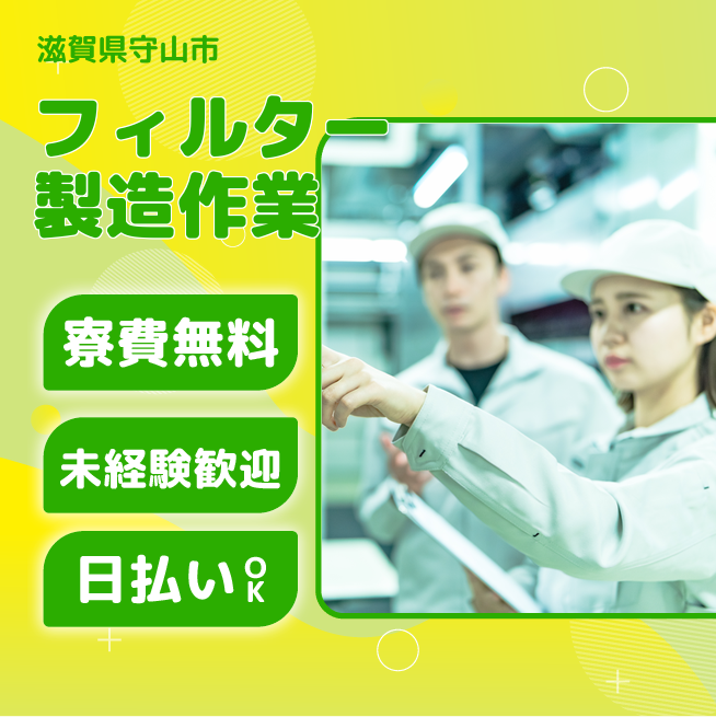 給与詳細 月収例 270,000円 日給例 12,400円 勤務地 滋賀県守山市 仕事内容 【フィルターの製造】