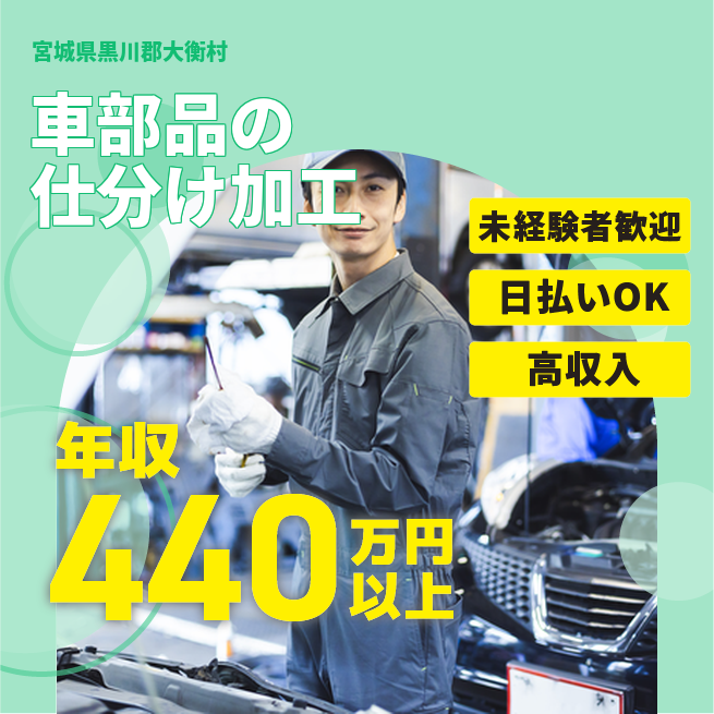 給与詳細 年収例 4,440,000円 月収例 370,000円 勤務地 宮城県黒川郡大衡村 仕事内容 【車部品の仕分け・機械加工】