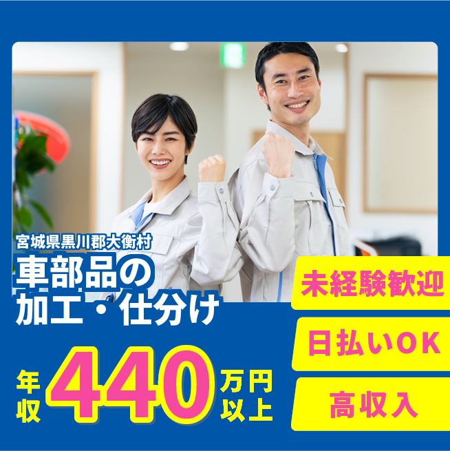 ◆日払い・仮払いOK(アプリでカンタン申請!) 交通費 支給あり 応募の流れ 本ページ内<応募する>ボタンより、必要項目をご入力の上、ご応募ください。 勤務地 【勤務地】宮城県黒川郡大衡村中央平 勤務時間 【勤務地】8:00~16:40(休憩45分+小休憩10分×2回)