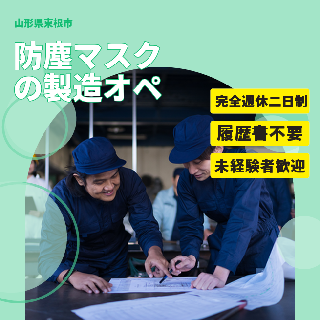 給与詳細 月収例 300,000円 日給例 15,000円 勤務地 山形県東根市 仕事内容 ・防塵マスクの製造オペレーター