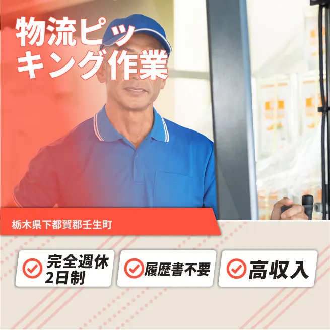 給与詳細 月収例 273,000円 日給例 11,200円 勤務地 栃木県下都賀郡壬生町 仕事内容 【業務内容】製品の集荷・出荷準備と物流作業