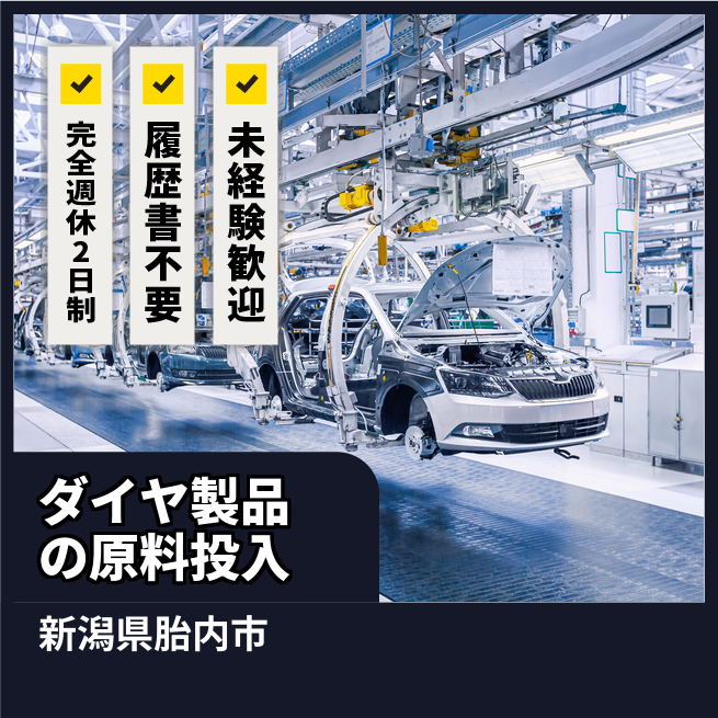 給与詳細 月収例 255,000円 日給例 12,750円 勤務地 新潟県胎内市 仕事内容 ダイヤモンド工具を製造している工場でのお仕事です。担当していただくのは焼結プレス工程で、材料を金型や容器に充填する作業のほか、プレス機の操作・管理を行います。プレス作業は一度セットすると完成までに時間がかかるため、1人で複数台の機械を担当し、工程内を動き回りながら進行状況の確認や対応を行うお仕事です。じっと同じ場所で作業するよりも、適度に体を動かしながら働きたい方に向いています。勤務は2交替制で、基本は8:15~17:15と17:15~翌2:15ですが、夕勤の時間帯が難しい場合は、8:15~17:15と13:15~22:15のシフトでの勤務も可能です。未経験の方でも丁寧に指導しますので、ものづくりに興味のある方や製造業にチャレンジしたい方のご応募をお待ちしています。