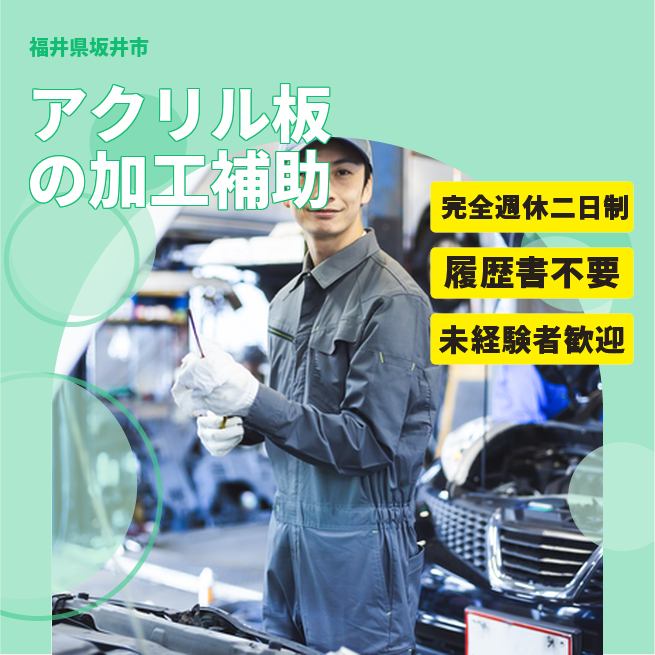 給与詳細 月収例 255,000円 日給例 12,750円 勤務地 福井県坂井市 仕事内容 【業務内容】クリーンルーム内でのアクリル化粧板の加工と撥水処理