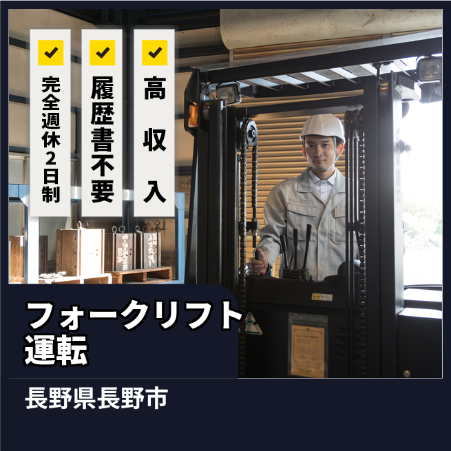給与詳細 月収例 135,000円 時給例 1,500円 勤務地 長野県長野市 仕事内容 【業務内容】 倉庫内でのリーチフォークリフト操作と商品の入出庫管理