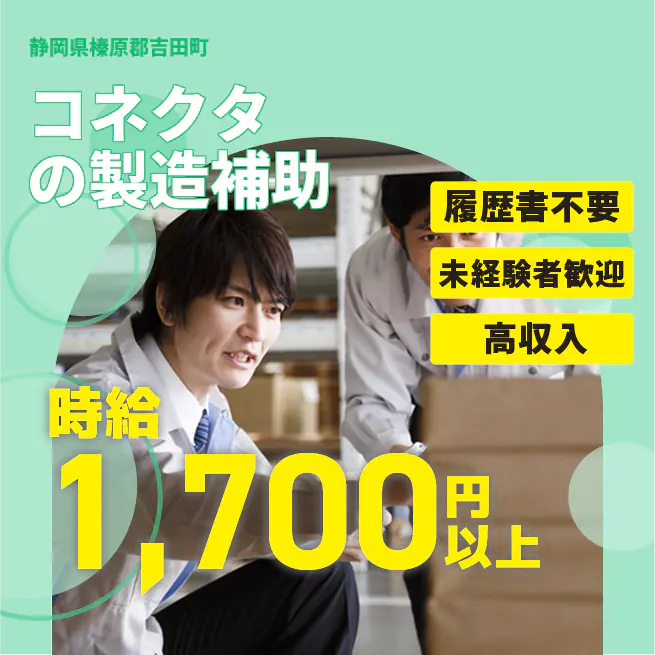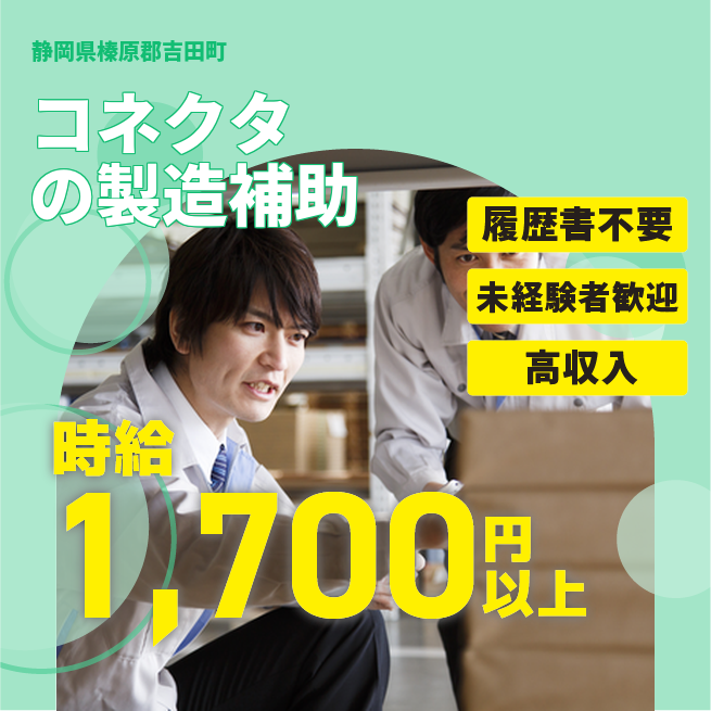給与詳細 月収例 300,000円 時給例 1,700円 勤務地 静岡県榛原郡吉田町 仕事内容 スマートフォンなどのデジタル製品に使用されるコネクターの製造に関わるお仕事です。