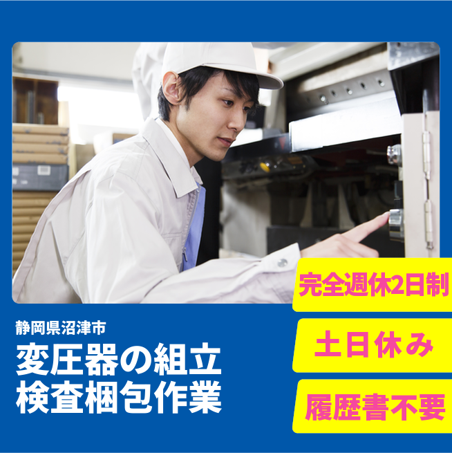 給与詳細 月収例 224,000円 日給例 11,200円 勤務地 静岡県沼津市 仕事内容 電気の圧力(電圧)を変える 「変圧器」 をつくる製造工程
