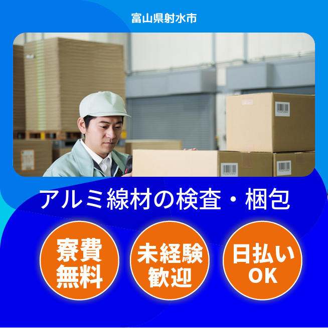給与詳細 月収例 256,949円 日給例 11,200円 勤務地 富山県射水市 仕事内容 アルミ線材の出荷検査・梱包・運搬