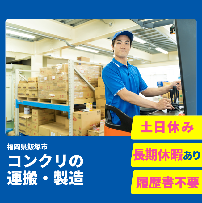給与詳細 月収例 240,000円 日給例 12,000円 勤務地 福岡県飯塚市 仕事内容 ウィルオブ・ワークの正社員として取引先のコンクリート製造工場で勤務いただきます。