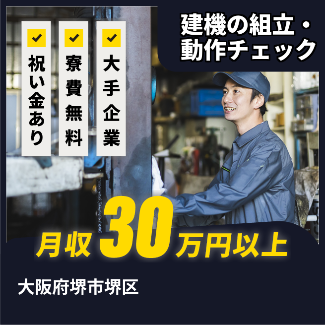 給与詳細 月収例 333,000円 時給例 1,600円 勤務地 大阪府堺市堺区 仕事内容 【ミニショベルやトラクターの組立(日勤)】