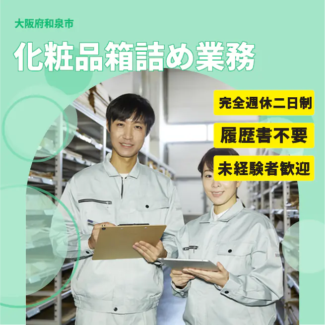 給与詳細 月収例 190,400円 時給例 1,190円 勤務地 大阪府和泉市 仕事内容 【業務内容】