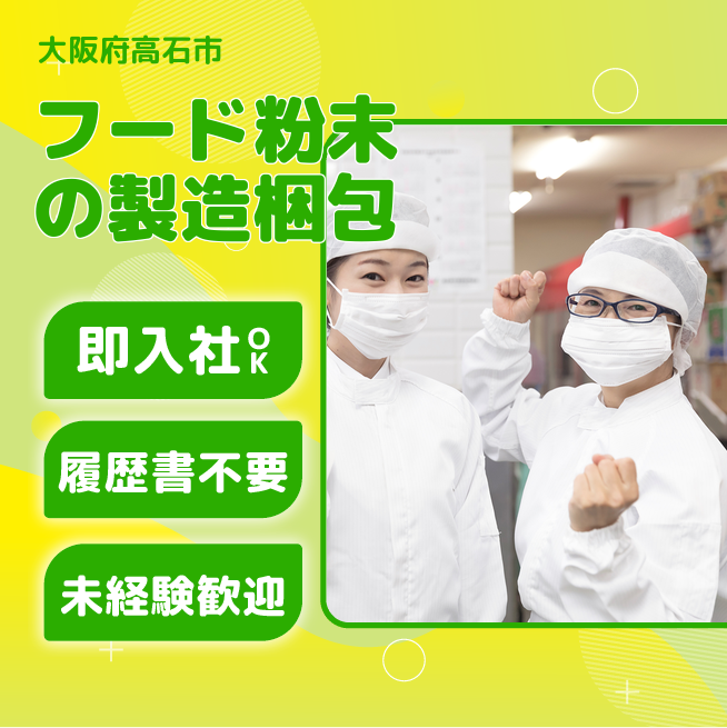 給与詳細 月収例 224,000円 日給例 11,200円 勤務地 大阪府高石市 仕事内容 \食品用パウダーの製造・加工・袋詰めスタッフ募集/