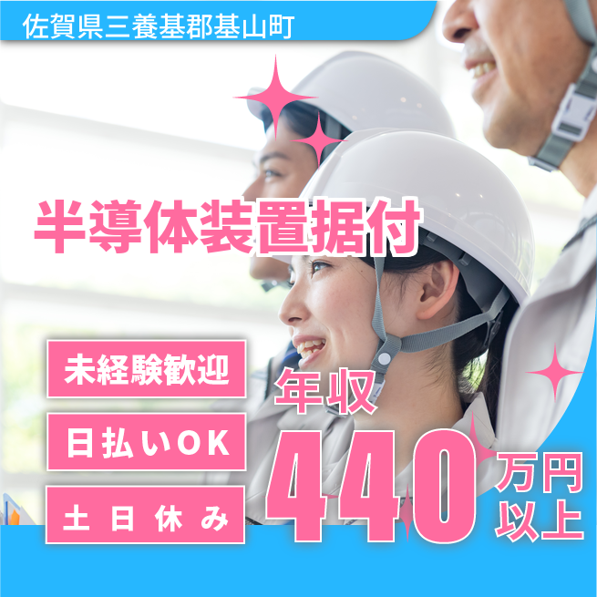 給与詳細 年収例 4,410,000円 月収例 367,500円 勤務地 佐賀県三養基郡基山町 仕事内容 【半導体装置のスタートアップ業務】