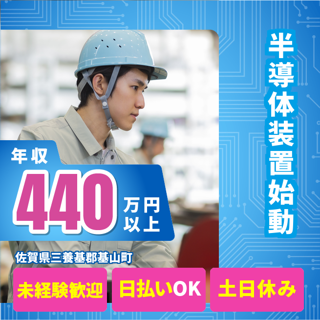 ※リーダー手当(2~3年実務経験後、実績により)/担当装置台数により3500~5000/1日あたり 交通費 支給あり 応募の流れ 本ページ内<応募する>ボタンより、必要項目をご入力の上、ご応募ください。 勤務地 【勤務地】佐賀県三養基郡基山町小倉 勤務時間 【勤務地】《時間1》08:30~17:40