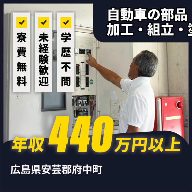 給与詳細 日給例 9,970円 月収例 311,521円 勤務地 広島県安芸郡府中町 仕事内容 自動車製造における部品加工や組立、塗装などをお任せします。