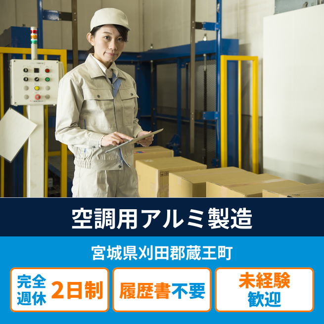 給与詳細 月収例 222,000円 日給例 11,100円 勤務地 宮城県刈田郡蔵王町 仕事内容 アルミ製品のプレス・検査・梱包、塗装前作業