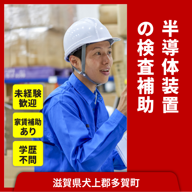 給与詳細 月収例 246,675円 日給例 10,400円 勤務地 滋賀県犬上郡多賀町 仕事内容 ・クリーンルーム内での半導体製造装置の製品検査及び補助作業。