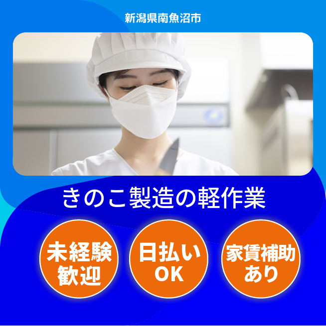 給与詳細 月収例 192,000円 時給例 1,200円 勤務地 新潟県南魚沼市 仕事内容 【きのこ製造工場の軽作業】
