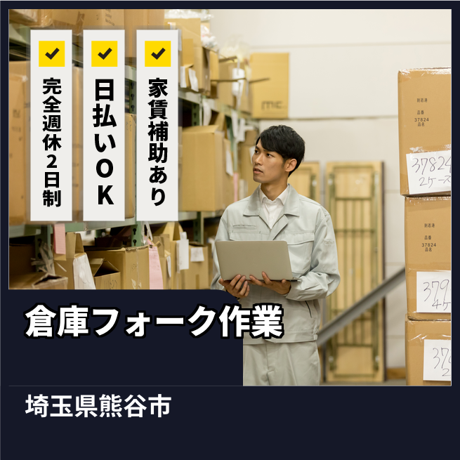 給与詳細 月収例 230,000円 日給例 10,400円 勤務地 埼玉県熊谷市 仕事内容 【倉庫内フォークマン作業】