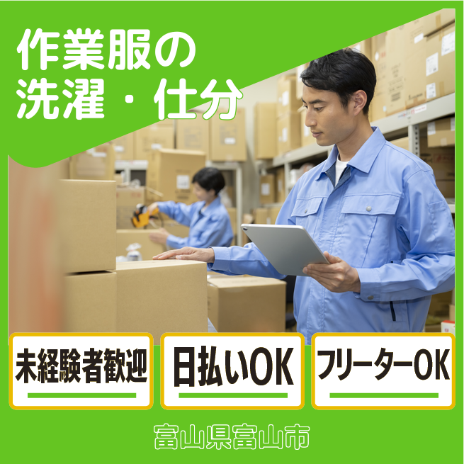給与詳細 月収例 200,000円 時給例 1,200円 勤務地 富山県富山市 仕事内容 【作業服の洗濯・仕分け】