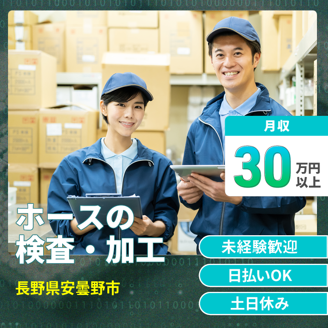 給与詳細 月収例 330,000円 日給例 10,880円 勤務地 長野県安曇野市 仕事内容 【ホースの検査・部品加工】
