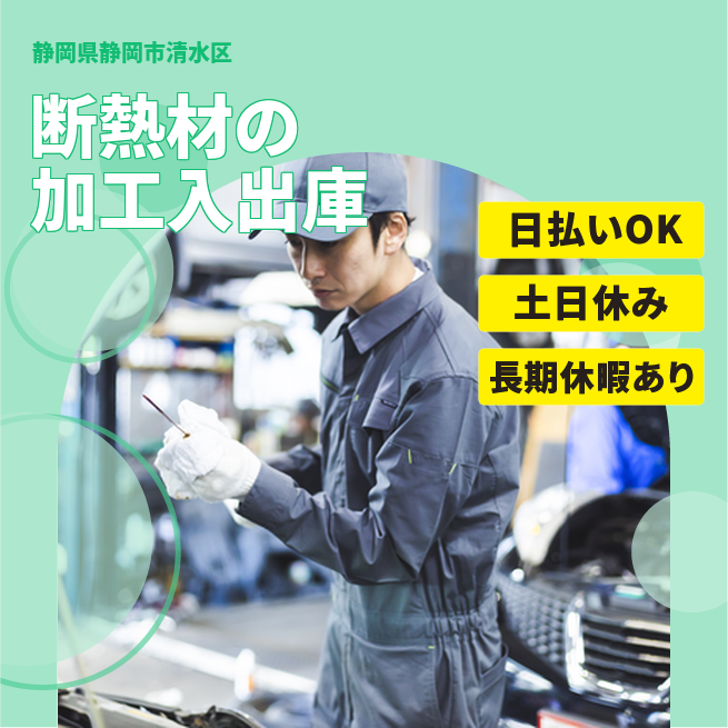 給与詳細 月収例 260,000円 日給例 10,800円 勤務地 静岡県静岡市清水区 仕事内容 【断熱材の加工・入出庫】