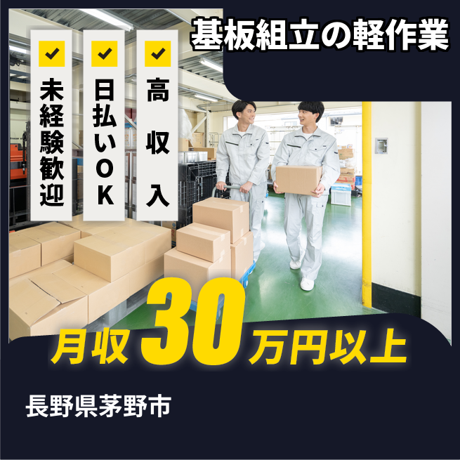 給与詳細 月収例 320,000円 時給例 1,600円 勤務地 長野県茅野市 仕事内容 【業務内容】基板に電子部品を取り付ける軽作業