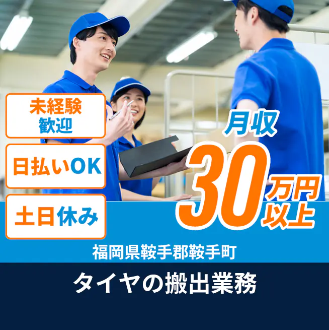 給与詳細 月収例 290,000円 日給例 11,440円 勤務地 福岡県鞍手郡鞍手町 仕事内容 【業務内容】 タイヤの出荷作業を行います。