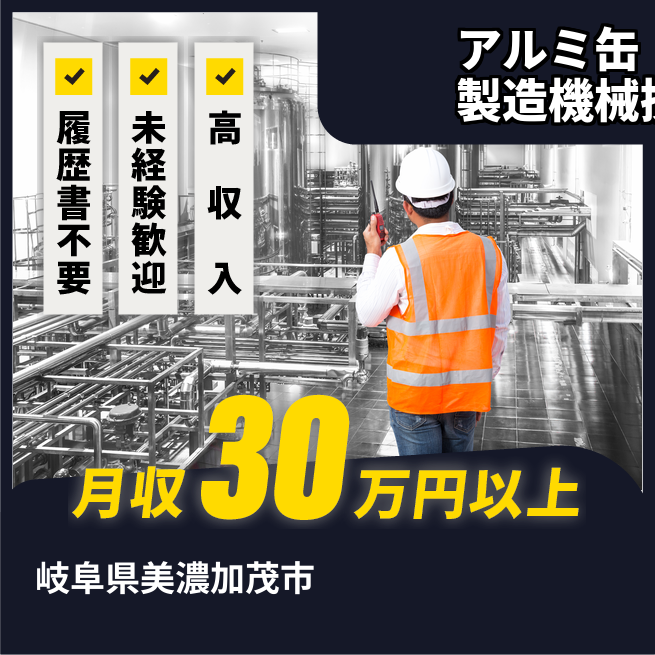 給与詳細 月収例 260,000円 時給例 1,900円 勤務地 岐阜県美濃加茂市 仕事内容 アルミ缶製造に伴う機械オペレーターのお仕事です。検査、他補助業務も一部あります。