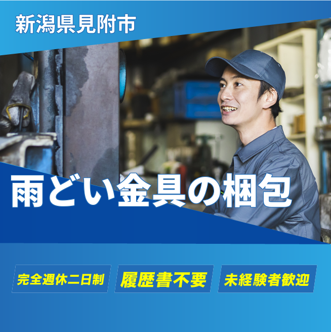 給与詳細 月収例 214,500円 時給例 1,100円 勤務地 新潟県見附市 仕事内容 雨どい金具の梱包、