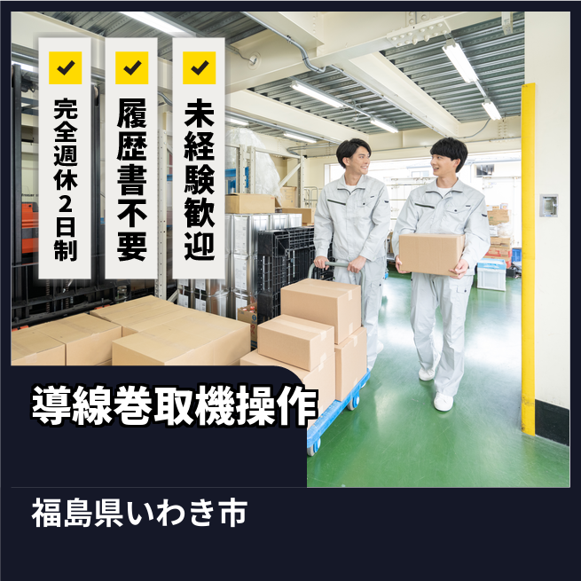 給与詳細 月収例 185,000円 時給例 1,200円 勤務地 福島県いわき市 仕事内容 ①導線巻き取りの機械オペレーター