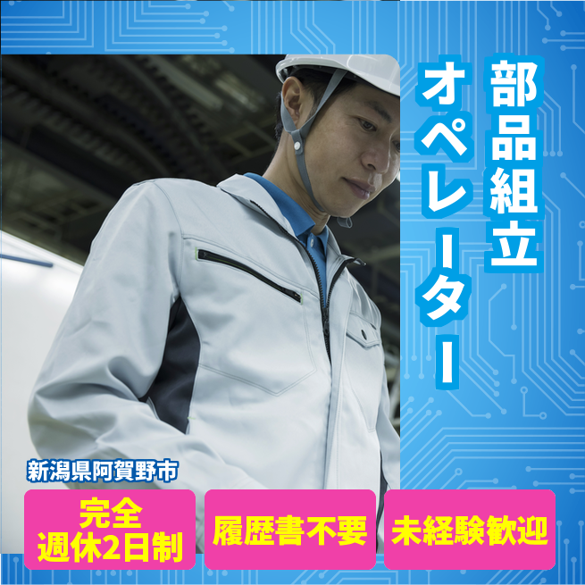 給与詳細 月収例 234,000円 時給例 1,200円 勤務地 新潟県阿賀野市 仕事内容 【業務内容】電子部品の組立機械オペレーター業務