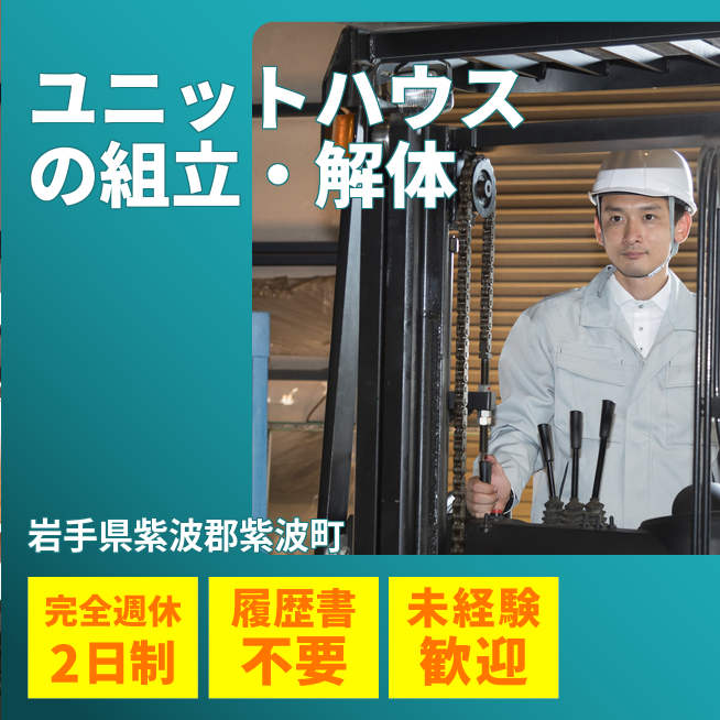 給与詳細 月収例 187,500円 時給例 1,300円 勤務地 岩手県紫波郡紫波町 仕事内容 【業務内容】ユニットハウスの組立・解体およびメンテナンス作業