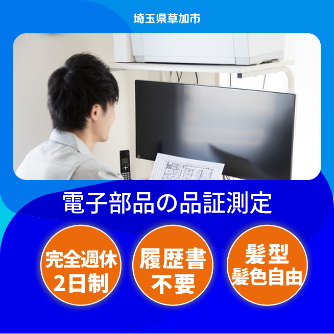 給与詳細 月収例 180,000円 時給例 1,300円 勤務地 埼玉県草加市 仕事内容 検定や試作等の品証測定業務全般
