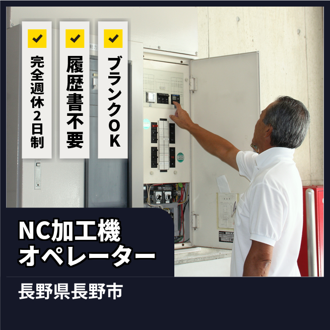 給与詳細 月収例 175,500円 時給例 1,300円 勤務地 長野県長野市 仕事内容 クリーンルーム内でNC加工機を操作し、製品加工や原料の混ぜ合わせなどを行うオペレーターを募集しています。