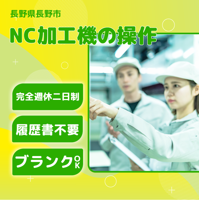 給与詳細 月収例 175,500円 時給例 1,300円 勤務地 長野県長野市 仕事内容 クリーンルーム内でNC加工機を操作し、製品の加工や原料の混ぜ合わせなどを行うオペレーターを募集しています。