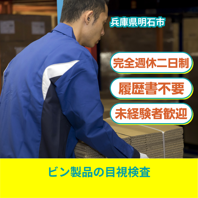 給与詳細 月収例 200,000円 日給例 10,000円 勤務地 兵庫県明石市 仕事内容 ビン製品製造ライン目視検査及び清掃等の付随業務