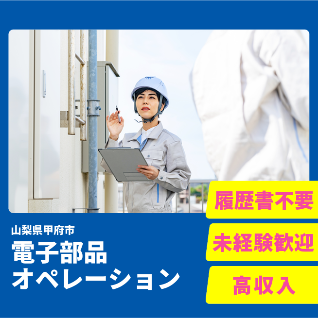 給与詳細 月収例 250,000円 日給例 12,500円 勤務地 山梨県甲府市 仕事内容 【業務内容】電子部品の製造機器操作