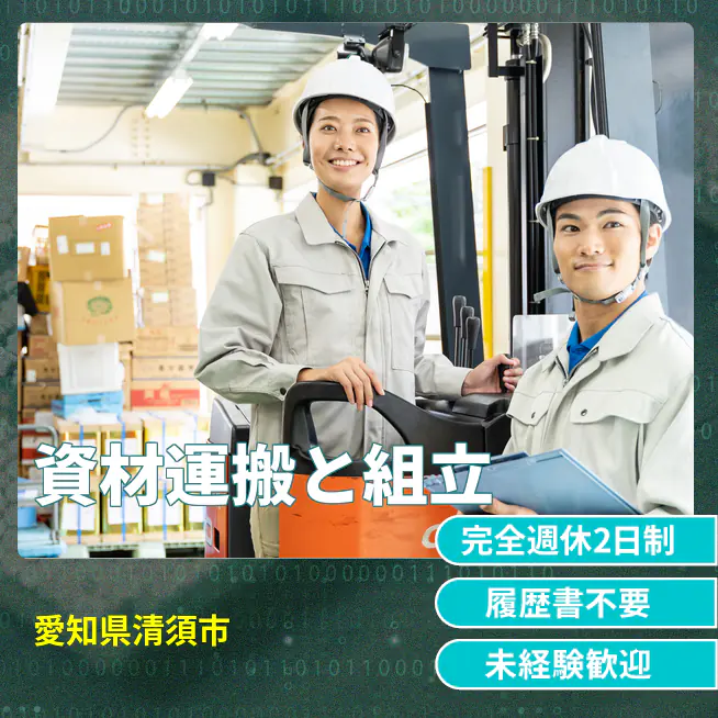 給与詳細 月収例 301,500円 日給例 15,075円 勤務地 愛知県清須市 仕事内容 【業務内容】資材の運搬と組立作業