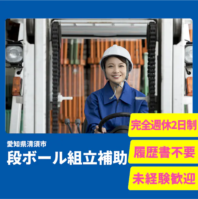 給与詳細 月収例 301,500円 日給例 15,075円 勤務地 愛知県清須市 仕事内容 【業務内容】資材の運搬や組立作業を行います。