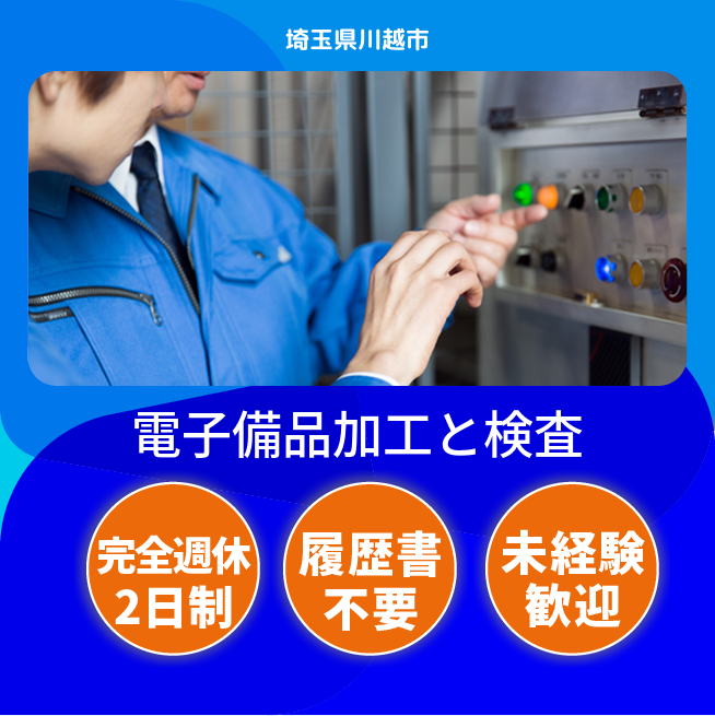 電子備品の加工機械オペレーター・測定器を使った抜き打ち検査。空調効いた環境で重量物もほぼないです。