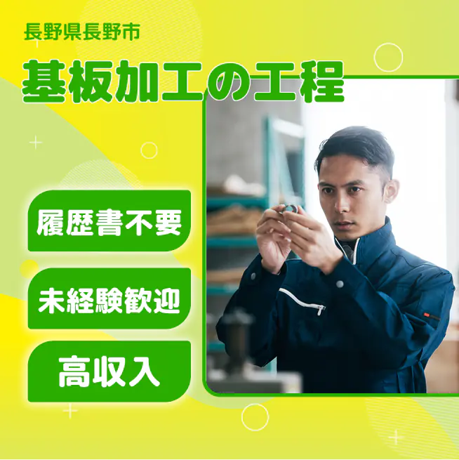 給与詳細 月収例 252,500円 日給例 12,625円 勤務地 長野県長野市 仕事内容 【業務内容】プリント基板製造における加工業務