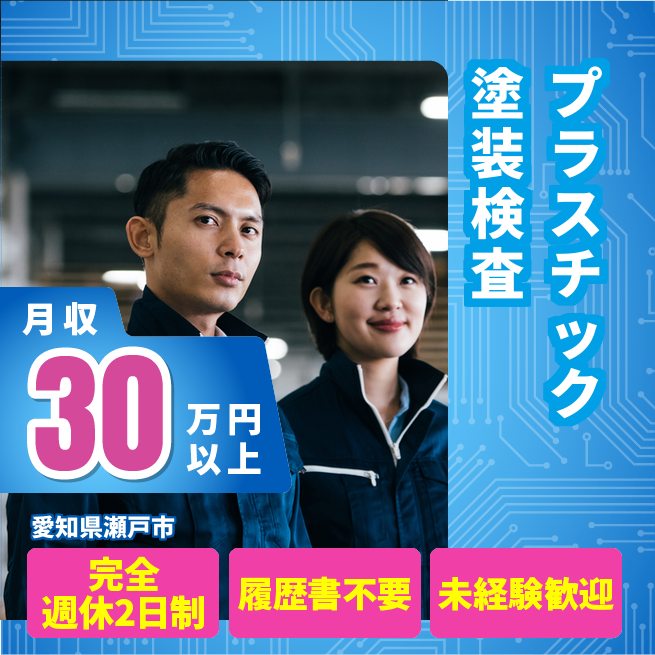 給与詳細 月収例 303,000円 時給例 1,700円 勤務地 愛知県瀬戸市 仕事内容 【業務内容】プラスチック製品の塗装検査業務